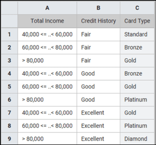 This decision table has two conditions: Credit History and Total Income. The possible decisions are in the matrix cells under Card Type. The logic reads something like this: If the applicant’s credit history is “Fair” and their income is between $40,000 and $60,000, then the applicant should be offered a “Standard” card.