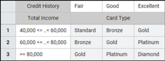 This decision table has two conditions: Credit History and Total Income. The possible decisions are in the matrix cells under Card Type. The logic reads something like this: If the applicant’s credit history is “Fair” and their income is between $40,000 and $60,000, then the applicant should be offered a “Standard” card.
