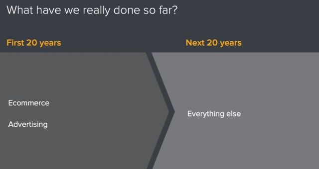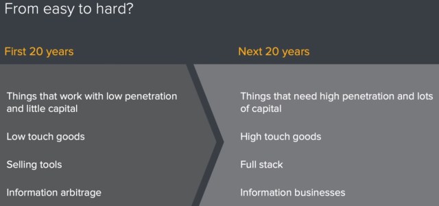 “Meanwhile, as companies address more and more of this with software and the internet, they do it in new ways. We began with models that presumed low internet penetration, low speeds, little consumer readiness and little capital. Now all of those are inverted. So, we used to do apartment listings and now Opendoor will buy your home; we used to do restaurant reviews and now you can get a hot meal delivered to your door. Tech is building different kinds of businesses, and so will take different shares of that opportunity, but more importantly change what those industries look like. Tesla isn’t interesting because of what it does to gasoline, but because of what it does to the car. Netflix changes TV, but so does Twitch.“