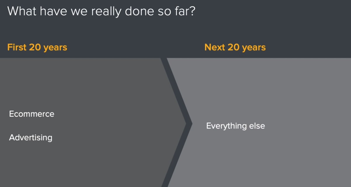 Benedict Evans, a partner at Andreessen Horowitz, gave a big annual presentation on the state of tech – ‘the end of the beginning’ at a16z’s annual tech conference on Nov. 16, 2018. “Close to three quarters of all the adults on earth now have a smartphone, and most of the rest will get one in the next few years. However, the use of this connectivity is still only just beginning. Ecommerce is still only a small fraction of retail spending, and many other areas that will be transformed by software and the internet in the next decade or two have barely been touched. Global retail is perhaps $25 trillion dollars, after all.”