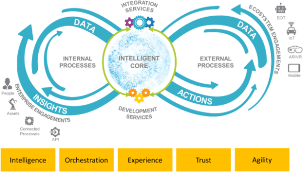Have you noticed operational decision services inside the Intelligent Core? They are the ones who provide the “capability to drive intelligent behaviour and actions, linking human and machine-derived knowledge from the widest possible information sources, will drive optimum system behaviour and business outcomes.“