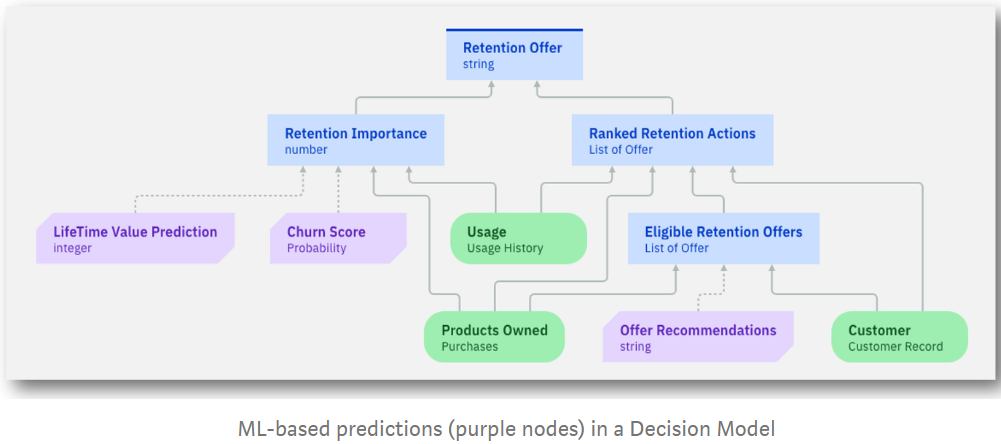 “To balance and convert those predictions into a specific retention action, we use business rules (inside the blue “decision” nodes). For example, the ML model might recommend promotions the customer is ineligible for, has already rejected, or are too expensive compared to the business value of retaining the customer. Business rules are used to filter out such offers and decide on a final retention action. This decision model — ML models included — is fully executable, meaning it’s deployed operationally in ADS without any coding required.“