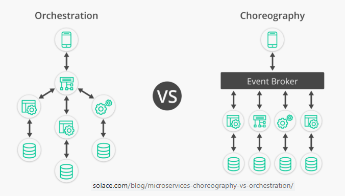 Jonathan Schabowsky from Solace.com focuses on the choreography of stateless event-driven microservices: “Orchestration entails actively controlling all elements and interactions like a conductor directs the musicians of an orchestra, while Choreography entails establishing a pattern or routine that microservices follow as the music plays, without requiring supervision and instructions.” In the decision management world the role of a conductor is usually played by a BPM engine or some kind of ruleflow, while choreography is implemented with as an event broker when “everything happens in an asynchronous manner, without waiting for a response or worrying about what happens next“. Link