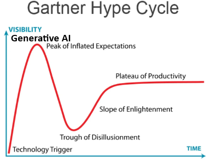 On Aug 16, 2023 Gartner published a press release Gartner Places Generative AI on the Peak of Inflated Expectations on the 2023 Hype Cycle for Emerging Technologies: “While all eyes are on AI right now, CIOs and CTOs must also turn their attention to other emerging technologies with transformational potential. his includes technologies that are enhancing developer experience, driving innovation through the pervasive cloud and delivering human-centric security and privacy. As the technologies in this Hype Cycle are still at an early stage, there is significant uncertainty about how they will evolve. Such embryonic technologies present greater risks for deployment, but potentially greater benefits for early adopters.” Link