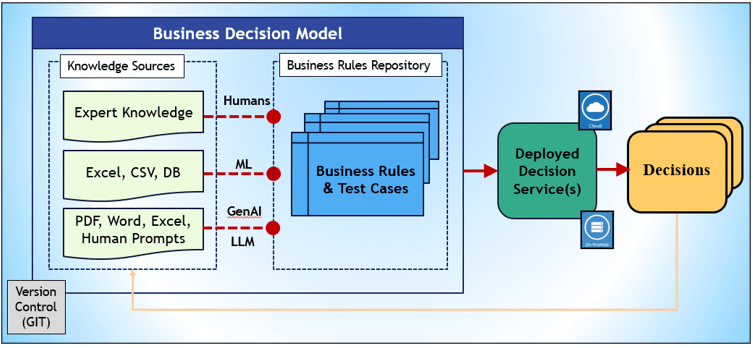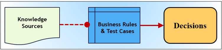 While the second line from “Business Rules” to “Decisions” is well-automated by different BR&DM tools, many presentations with GenAI in mind concentrated on the first line from “Knowledge Sources” to “Business Rules and Test Cases”. To talk about these presentations and related discussion, let’s expand the above simplified schema with more details: