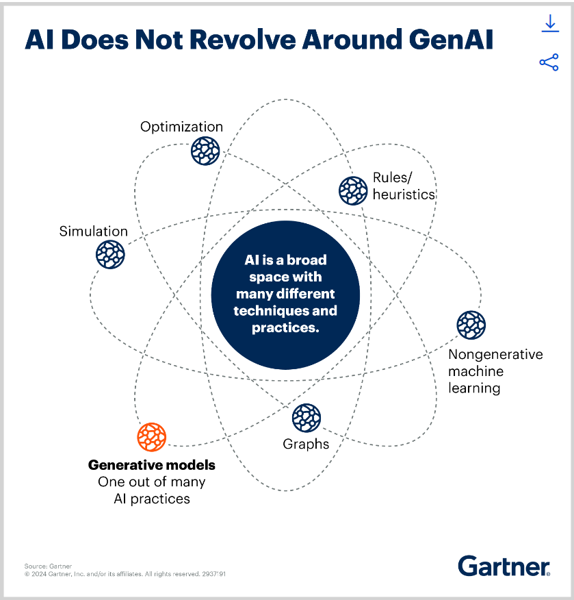 Gartner: “Generative AI is only one piece of the much broader AI landscape, and most business problems require a combination of different AI techniques. Ignore this fact, and you risk overestimating the impacts of GenAI and implementing the technology for use cases where it will not deliver the intended results.” Link