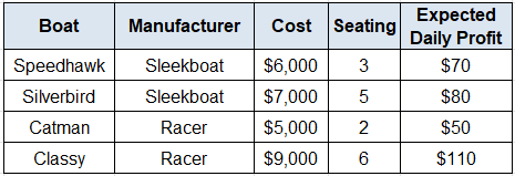 Floataway tours has $420,000 that may be used to purchase new rental boats for hire during the summer. The boats can be purchased from two different manufacturers. Floataway tours would like to purchase at least 50 boats and would like to purchase the same number from Sleekboat as from Racer to maintain goodwill. Also, Floataway Tours wishes to have a total capacity of at least 200. Data about the boats is summarized below: