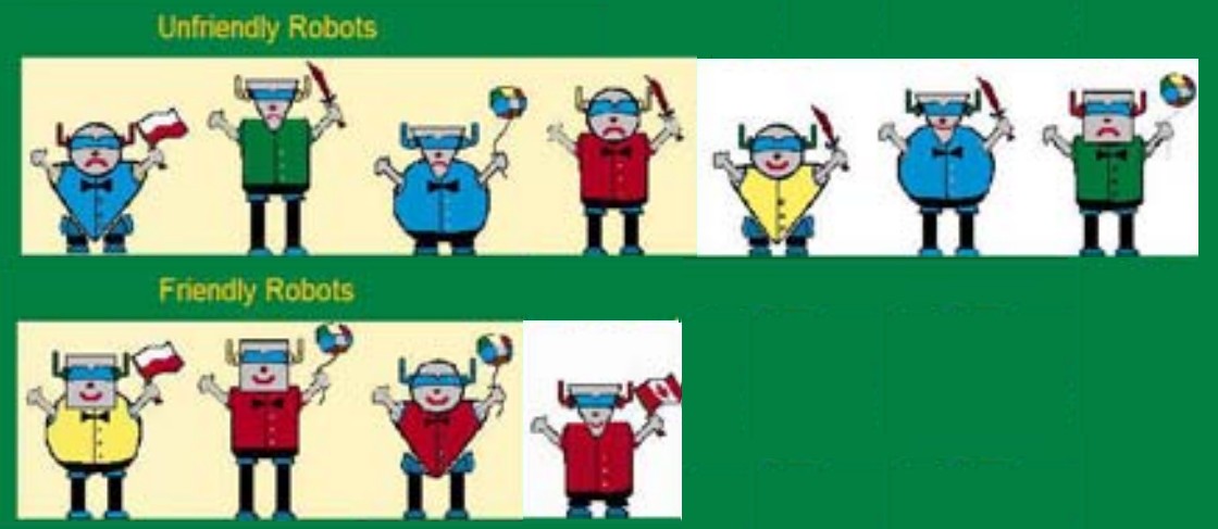 The police asked its analysts to specify rules to identify if a robot is friendly or unfriendly, The rules were expressed in terms of any features you can see in robots, such as the shape of the head, the color of the jacket, the height, the color of their antennas, what they are holding in their hands, whether they are smiling or not, etc. The analysts quickly identified simple rules that succeeded for the robots from the above lists. Can you guess which rules were used?
