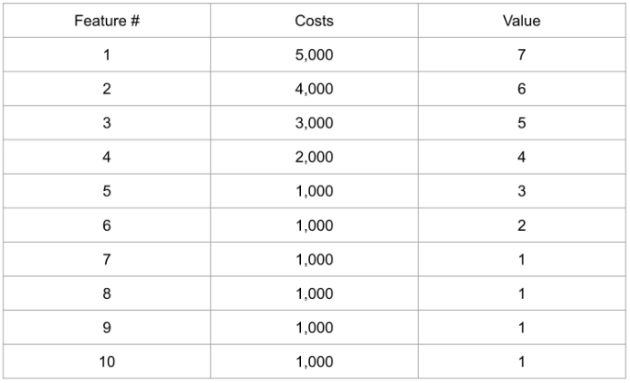 The client leaves the decision of which features to the developer. She wants to delight the client and asks you which features would be best to select. We have the budget constraint and two objectives. Can you devise a rational way to trade them against each other?