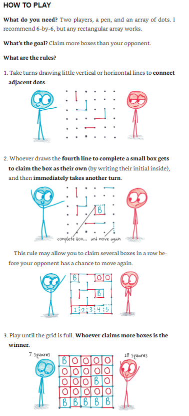Your decision model should be able to play the popular children game “Dots and Boxes“. Its rules on the left are borrowed from the book “Math Games with Bad Drawings” by Ben Orlin.